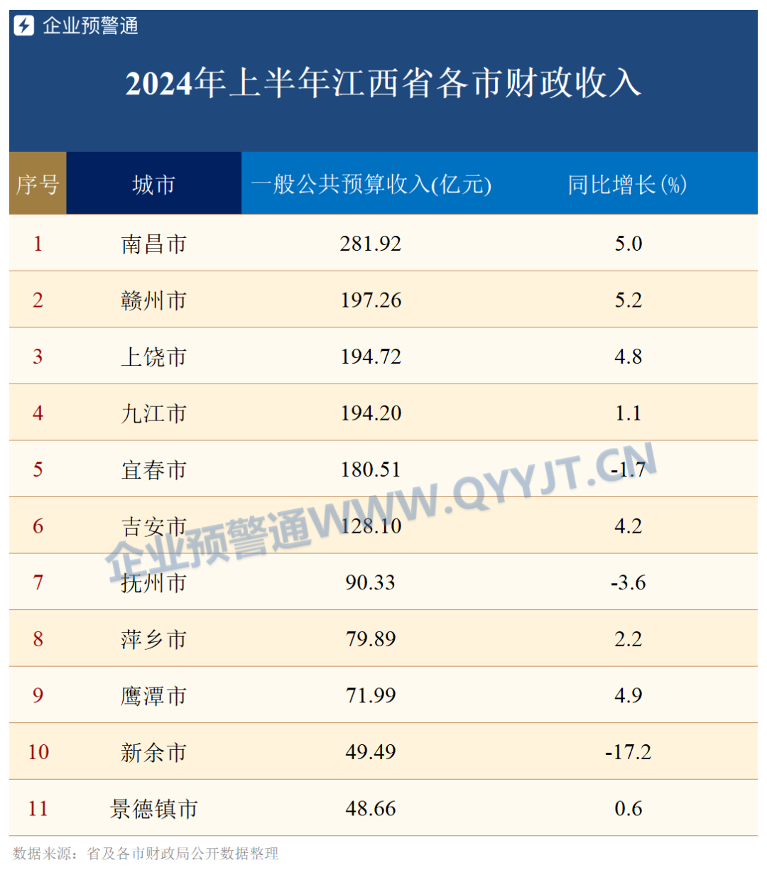 2024年1-6月配资炒股哪家好,江西省地方财政收入1808.6亿元,同比下降1.25%,增速相较于一季度(-3.6%),降幅逐渐收窄。江西下辖的11个市中,8市增速同比上涨,其中,赣州市上半年财政收入同比上涨5.2%,位居全省第一,省会南昌市增速同比上涨5%,鹰潭市同比上升4.9%。仅3市上半年财政收入增速为负,其中,新余市增速同比大降17.2%,下降幅度最大,已连续两个季度下跌超15%,另外两个下降的城市是抚州和宜春,分别下降3.6%和1.7%。
